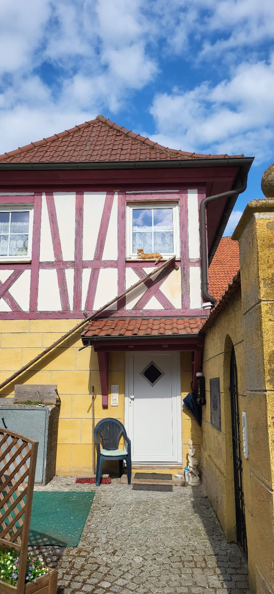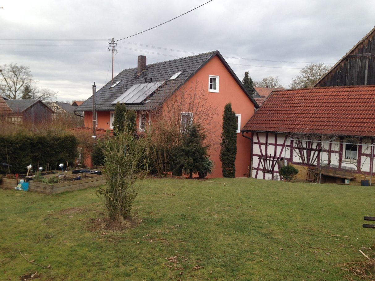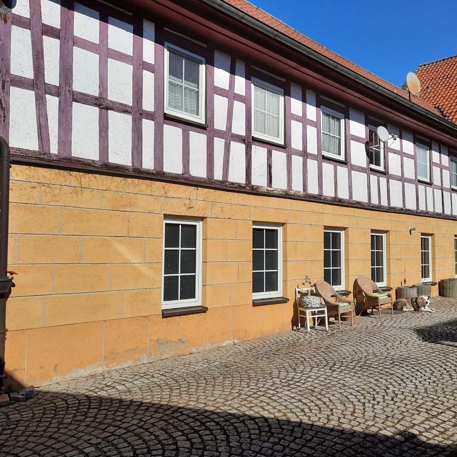 Die Bauform unseres Hofes spiegelt eine in Franken weitverbreitete und besonders charakteristische ländliche Architektur wider: den Vierseithof. Diese typische Hofform besteht aus vier Gebäuden – Wohnhaus, Stall, Scheune und Wirtschaftsgebäude – die sich schützend um einen Innenhof gruppieren. Ursprünglich als funktionale Einheit für bäuerliche Selbstversorgung gedacht, vereinte sie Wohnen, Tierhaltung und Vorratshaltung an einem Ort. In unserem Fall zeigt sich die Bauweise in einer reizvollen Mischung aus massivem Bruchstein und Fachwerk – typisch für fränkische Baukunst vom 18. bis ins 19. Jahrhundert.